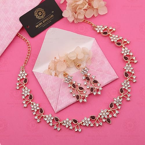 This jewellery set consists of a necklace and a pair of earrings.Rose Gold-Plated Necklace, has Artificial Stone studded detail, secured with a S Hook closure. A pair of matching Drop Earrings, each secured with a Post and Back Closure.Brado Jewellery is a celebration of womanhood, a celebration of the life of a confident, down to earth woman who is here in today’s modern world with traditional sensibilities and a whole lot to give and share.Brado Jewellery brings the best, exquisite design jewelry to you at affordable prices. Our expert eye for craftsmanship, rarity, and quality can be seen through all of our flattering designs. This breathtaking necklace with earrings jewelry set is great for making a fashion statement. It will bring you a lot of compliments. Traditional necklaces add a hint of raw ethnic beauty to any look. Representing a classic fusion of exquisite craftsmanship and feminine elegance, this set will definitely be a treasured inclusion in every woman's jewelry collection. Best gifts for mother, sister, wife, and girlfriend. Features: Comfortable and lightweight Non-allergic to skin Beautifully crafted for a nice look Our Jewelry is designed to enhance inner beauty and confidence to offers an effortless complement to elegant outfits. This is a must-have design that can be worn on special occasions to boost up your style factor and enhance the beauty of yours.